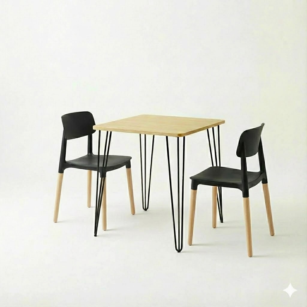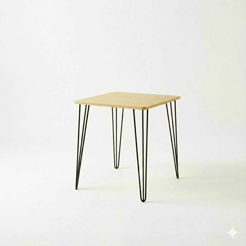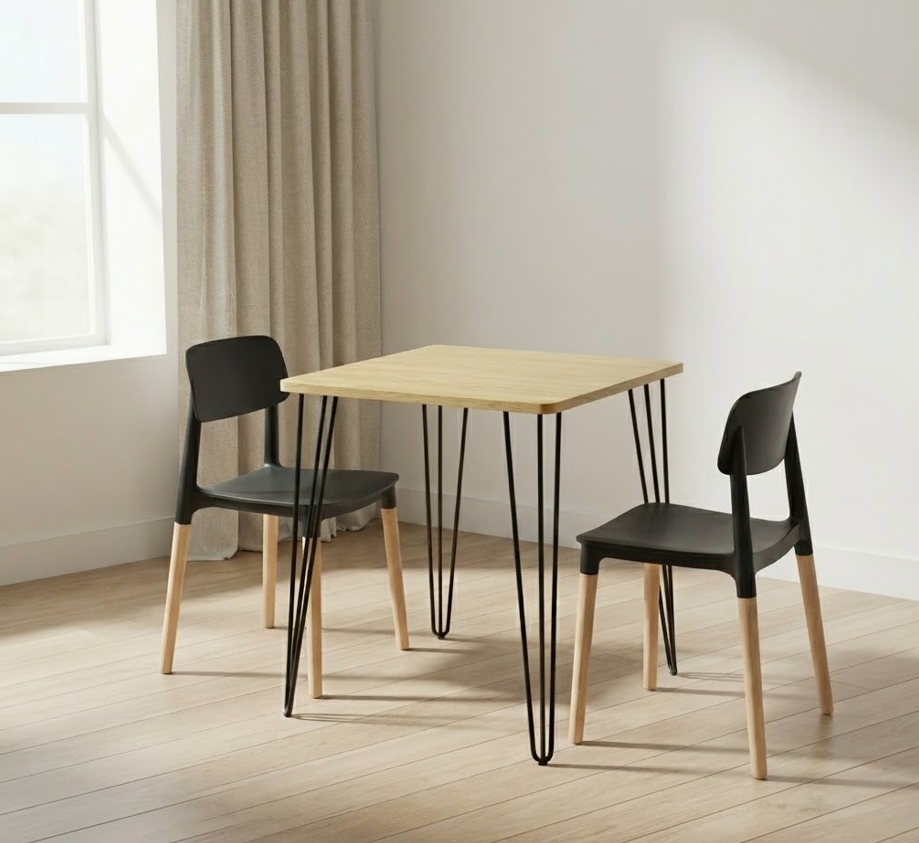 La mesa cuenta con una tapa resistente de excelente terminación y cuatro patas tipo hairpin negras, que aportan un look industrial moderno y gran estabilidad. Su tamaño permite comer cómodamente sin ocupar espacio de más, siendo una solución versátil para el uso diario.