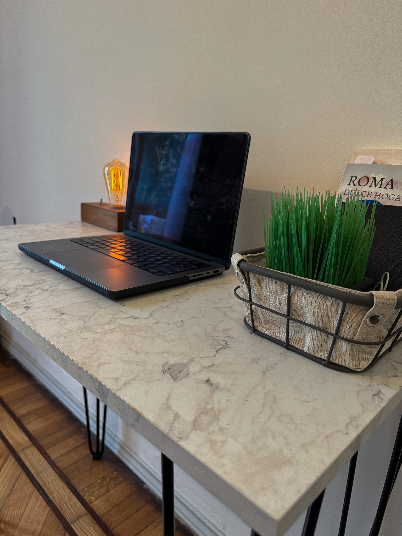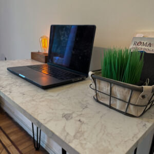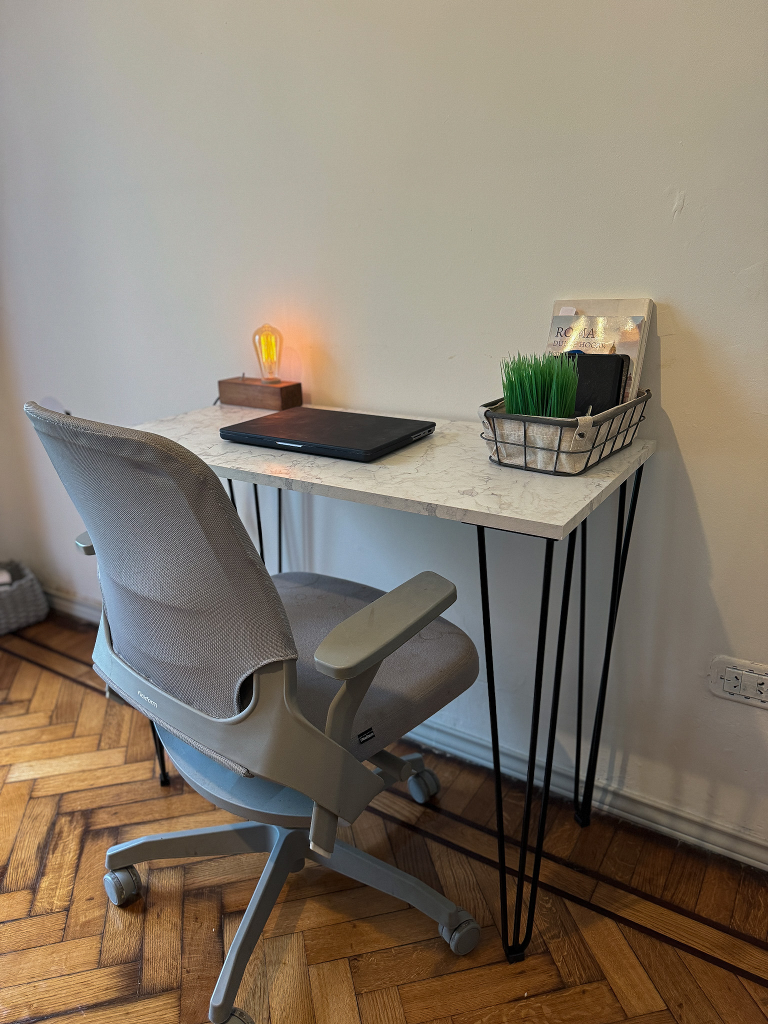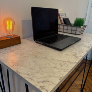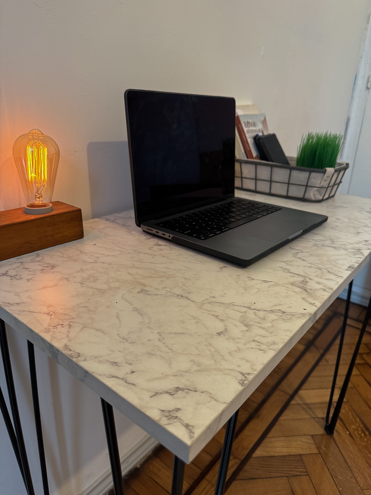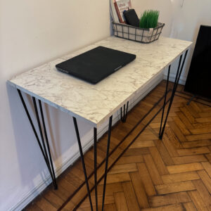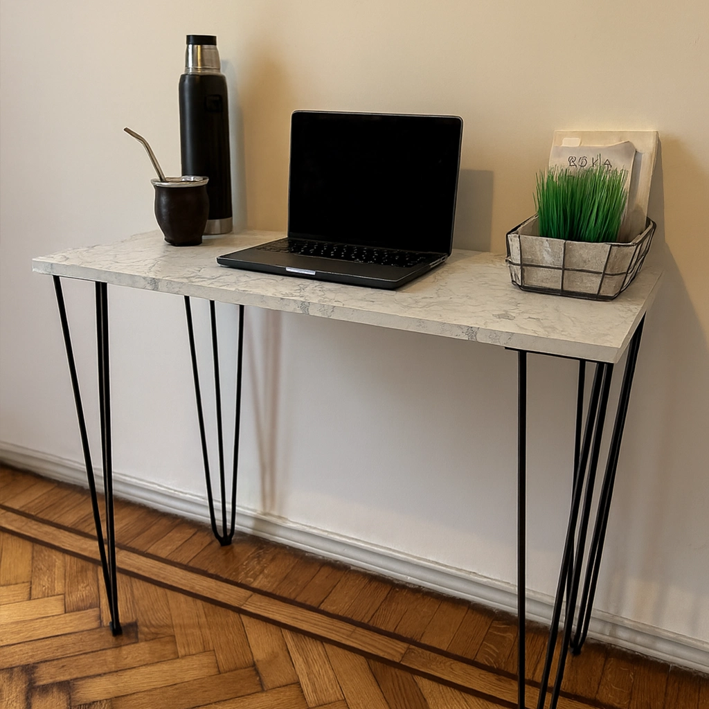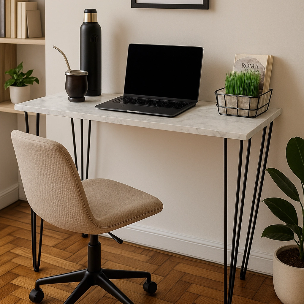 Escritorio Hairpin con tapa símil mármol, ideal para oficina o hogar. Diseño elegante y funcional que transforma cualquier espacio en un lugar de trabajo moderno.