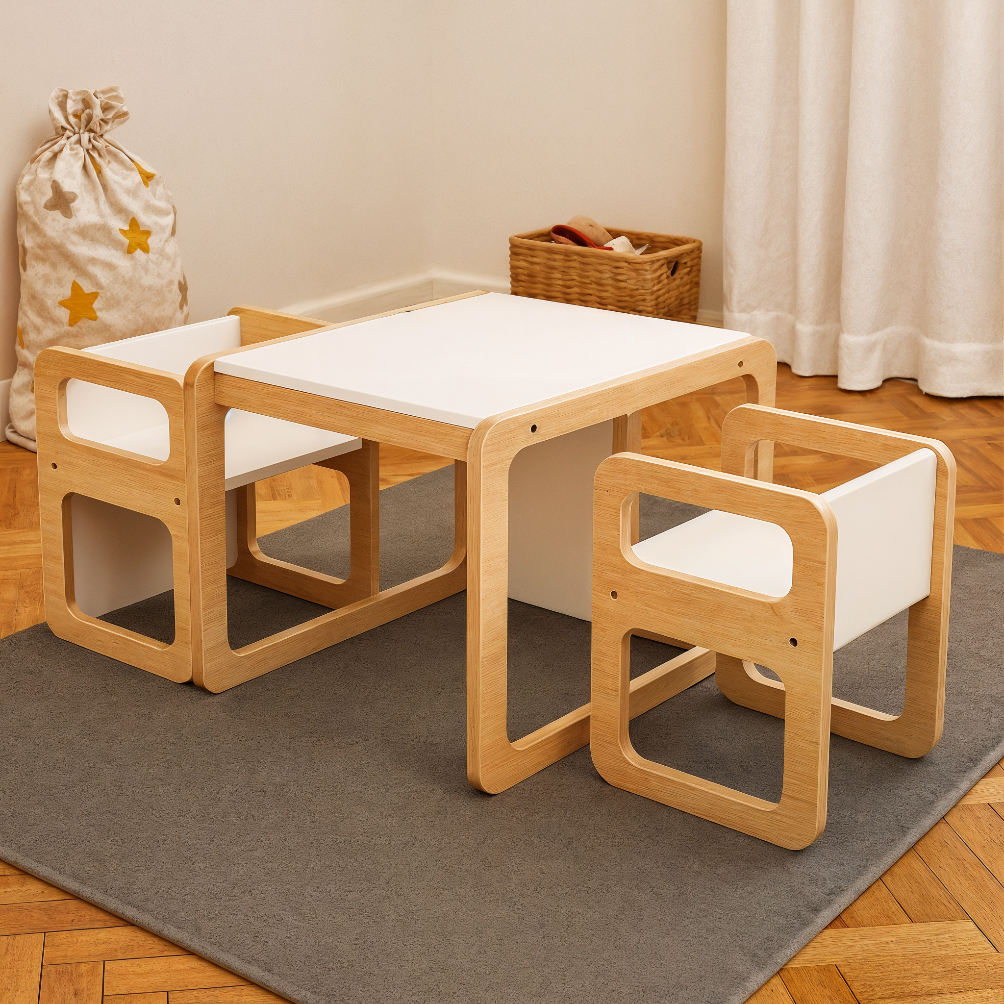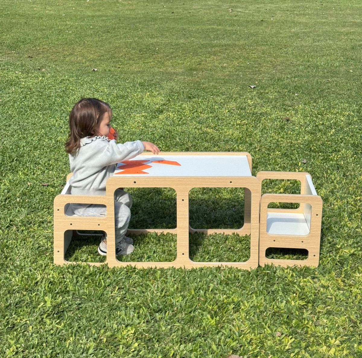 Diseñada para acompañar el crecimiento y la creatividad de los más pequeños, esta mesa Montessori incluye 2 sillas evolutivas que se guardan perfectamente debajo, optimizando el espacio y manteniendo todo en orden.