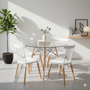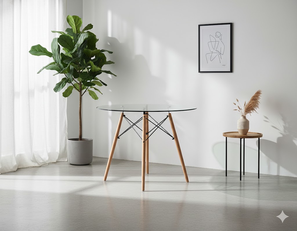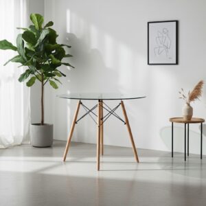 Mesa Eames Glass FLOKI: una pieza de diseño nórdico que combina un tablero redondo de vidrio templado de 1 metro con una estructura de hierro macizo y patas de madera maciza. Su estilo moderno y elegante se adapta a cualquier ambiente, ofreciendo durabilidad, estabilidad y fácil mantenimiento. Ideal para comedores, cocinas u oficinas, esta mesa se integra perfectamente con distintos tipos de sillas y se convierte en el centro de reuniones, momentos y espacios acogedores.