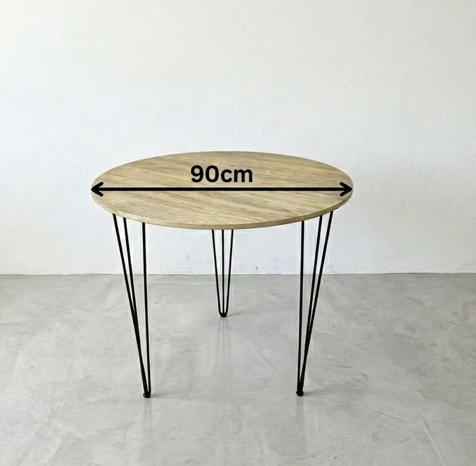 Disponible en medidas de 90 a 100 cm de diámetro, ofrece posibilidades de uso: como mesa auxiliar, de comedor o incluso como mesa decorativa central. Sus patas hairpin negras de 75cm de alto generan un contraste moderno que aporta un toque urbano y sofisticado, adaptándose a estilos decorativos contemporáneos, rústicos o eclécticos.