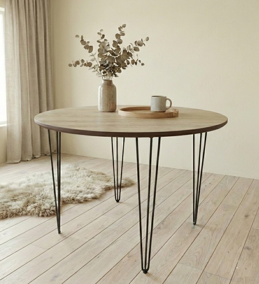 La Mesa Hairpin Redonda Cajú fusiona el encanto natural de la madera con un diseño moderno de inspiración industrial. Su superficie en tono cajú resalta vetas elegantes que aportan calidez y personalidad al ambiente, siendo perfecta tanto para comedores como para salas de estar o rincones de trabajo creativo.