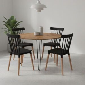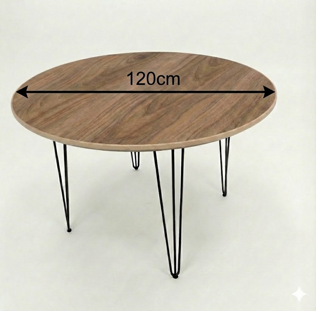 Gracias a sus opciones de diámetro de 90cm a 120cm, esta mesa es altamente versátil: puede funcionar como mesa principal en comedores pequeños, mesa auxiliar en un living o incluso como pieza decorativa en una oficina o rincón especial. Las tres patas hairpin negras de 75cm de alto aportan un contraste industrial que realza aún más la estética nórdica del conjunto.