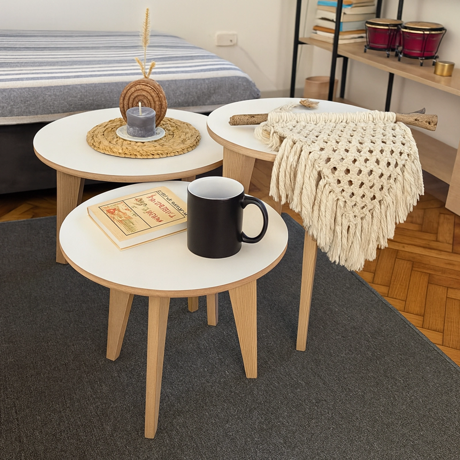 El Set Ratona Redondas es la solución ideal para quienes buscan funcionalidad y estilo en su hogar. Con tres mesas de diámetros 50 cm y 40 cm, y patas de diferentes alturas, este conjunto es perfecto para cualquier espacio. Las tapas blancas y patas de roble americano añaden un toque moderno y elegante. Transforma tu hogar con estas mesas que combinan diseño y practicidad.